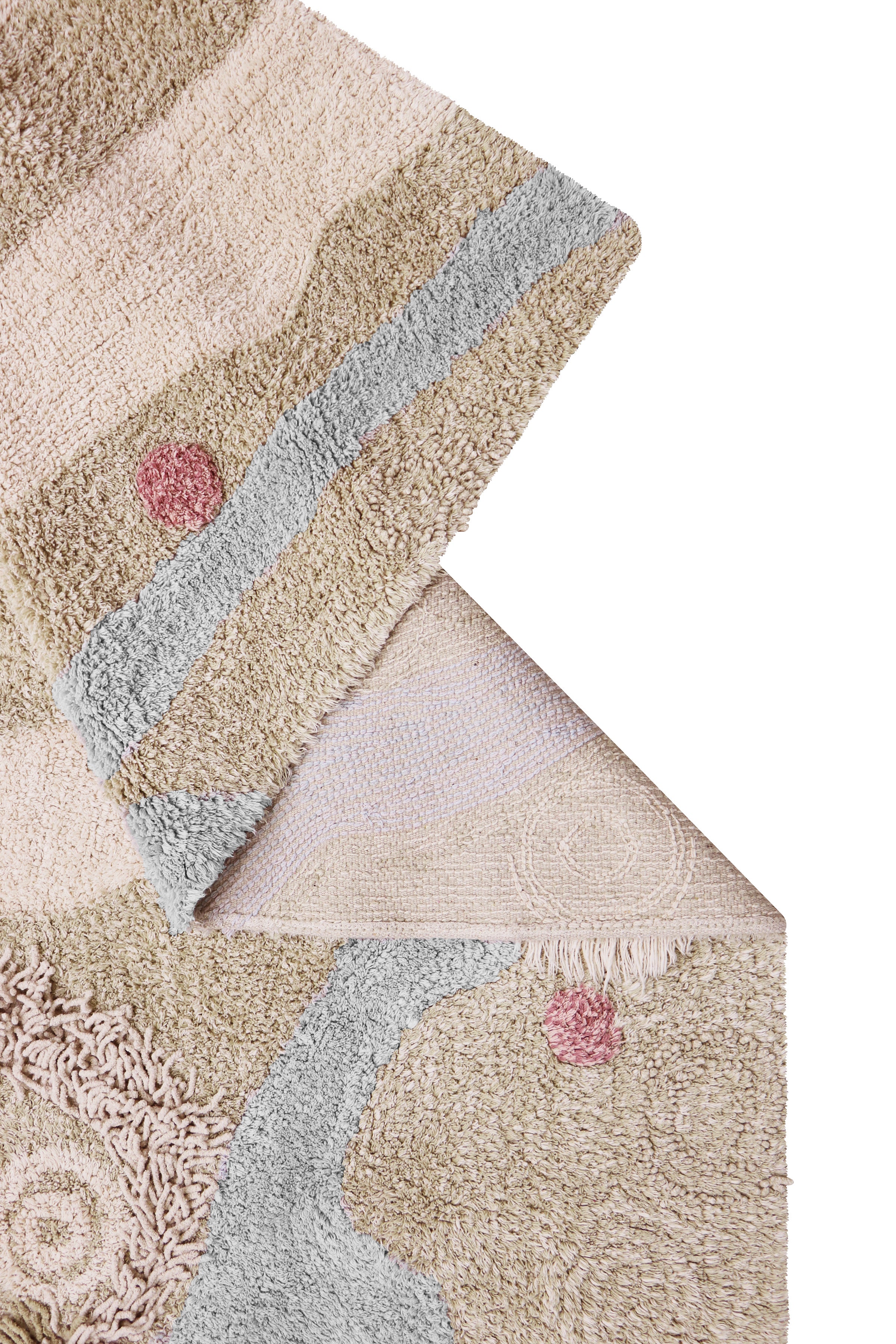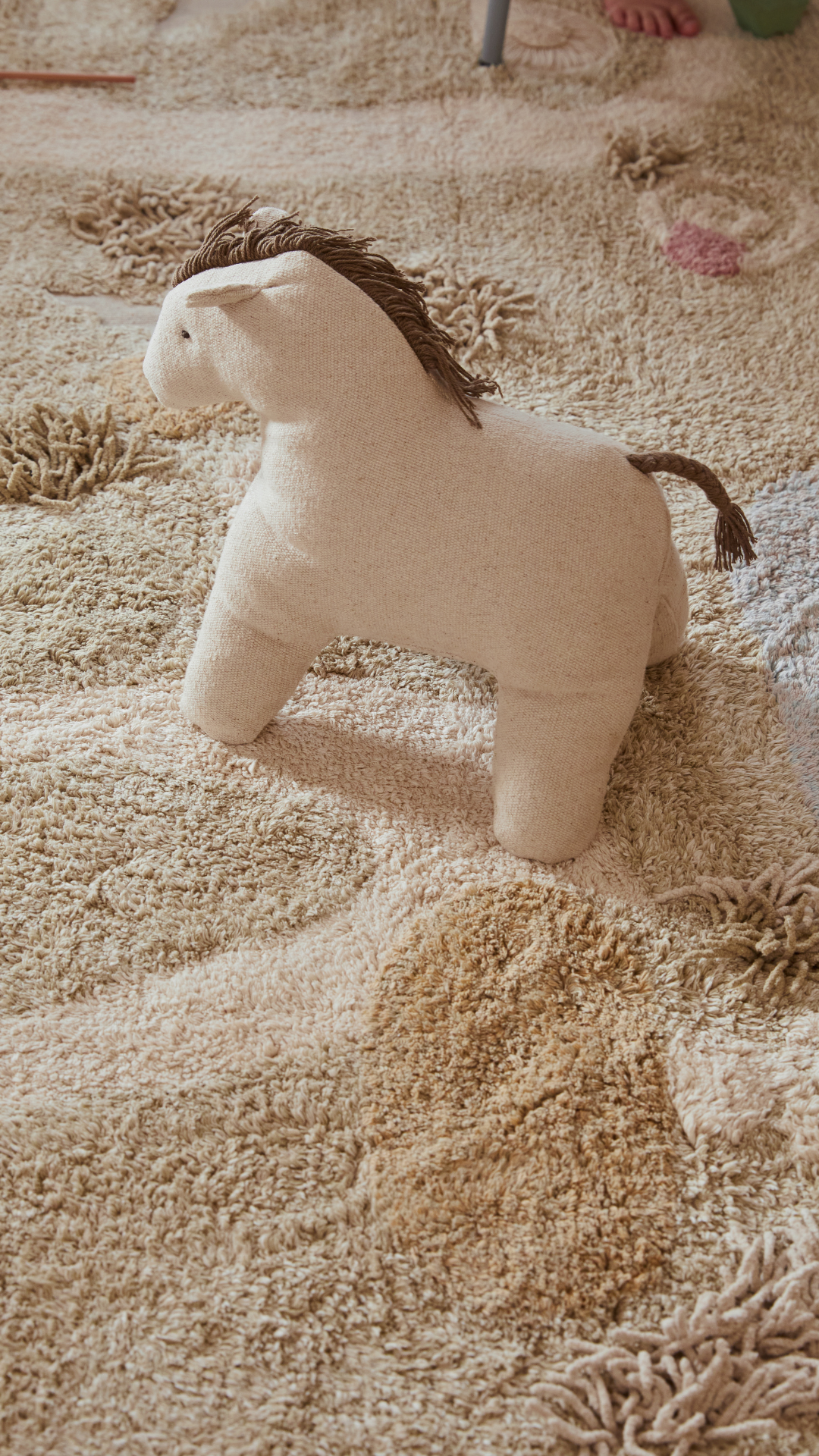 A playful and decorative children's rug, inspired by the natural landscape. The rug's design resembles a winding path and natural forms, inviting children to create their own play stories right on the floor. Different textures and heights create a subtle relief effect, while the soft color palette – natural earthy, green, and blue hues – allows the rug to be easily matched with various children's room interiors. The rug comes with a soft toy, which becomes part of the game and allows children to immerse themselves even more in the created natural world.