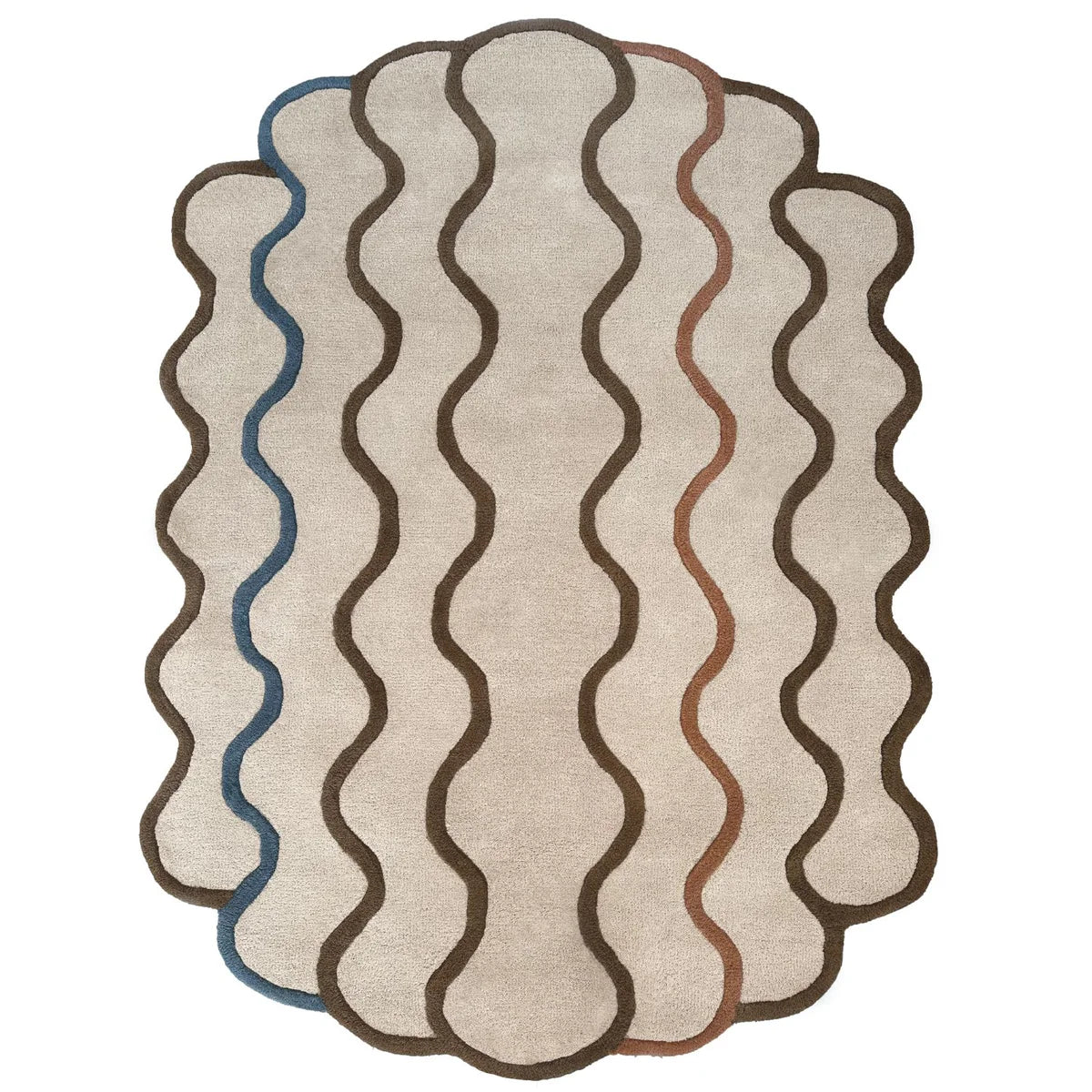 Shell kilimas – Edito Paris kilimas, įkvėptas jūros formų ir kriauklių kontūrų, su švelniais smėlio, terakotos ir mėlynais atspalviais, kurie sukuria elegantišką, ramią interjero atmosferą.